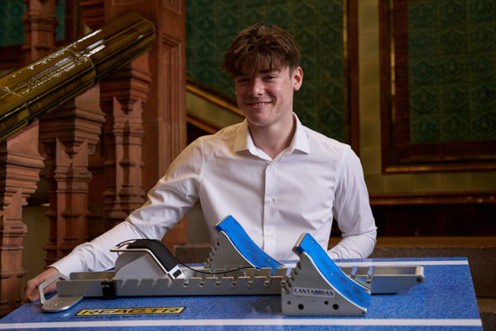 | “I've made an acceleration tracker for sprinters. It basically uses a reel coming from the back of the starting blocks. It also uses a speaker to start the athletes off, and then when they start, it tracks the acceleration on an app that I designed on the coach's or user's phone. I'm a sprinter myself, so I was sort of inspired from problems that I come across in daily training life. Winning this award is a real boost. It's going to help with applications for university, and it motivates me with my A-level projects. I'd like to thank my D&T teacher, Mr Harper, and my parents. That's where the ideas come from and all the help.” - Lewis Barnes, Brynteg Comprehensive School, Overall Winner. |